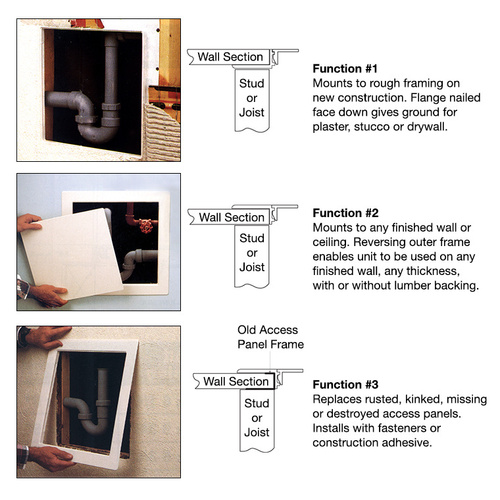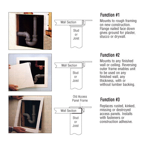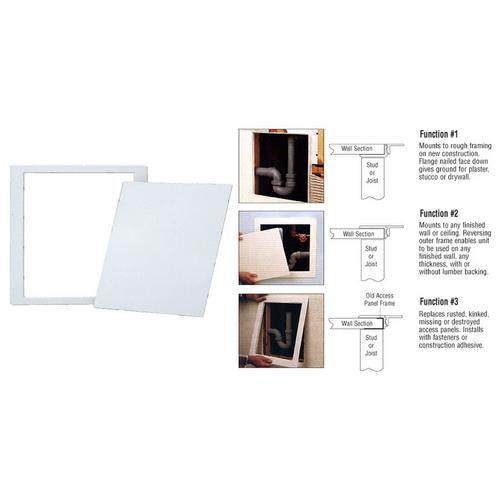 This CRL All Purpose Access Panel is ideal for use anywhere access into a wall is required. Many times plumbing leaks, cable runs, or area access requires a hole being made in the wall. With this panel, an easy cover up can be done without having to re-drywall. Simply cut the hole and install the outer frame with fasteners or construction adhesive and then snap in the door.